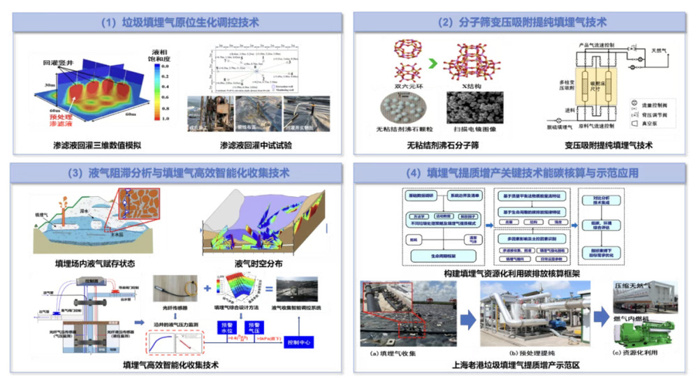 在“双碳”和垃圾分类背景下,针对老旧垃圾填埋气品质差、收集率低等难题,团队研发了原位回灌生化调控与末端高性能成型分子筛变压吸附协同提质关键技术;基于液气多场耦合模型,开发了考虑垃圾体非均匀性的智能化调控竖井抽气系统;研究融合LCA-IPCC-QRA方法,构建填埋场综合处置系统的碳排放核算方法体系,并集成填埋气提质增产资源化技术,开展相应工程示范,创新实现了填埋场低碳运行与碳盈利新模式,为提升填埋气资源化利用与碳排放控制提供了系统性解决方案。