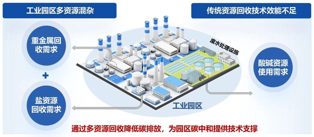 面向我国微电子、化工、钢铁等行业低碳转型发展需求,团队创新了络合态重金属电催化破络回收一体化技术、膜法分盐同步超倍浓缩结晶工业盐回收技术、浓缩液双金属双极膜制酸碱技术,集成构建了工业园区多资源定制化回收技术体系,通过水资源、重金属、工业盐、酸碱等资源化利用,减少了园区的碳排放,相关技术成果已在园区层面成功落地,为实现工业园区碳中和提供了有力技术支撑。