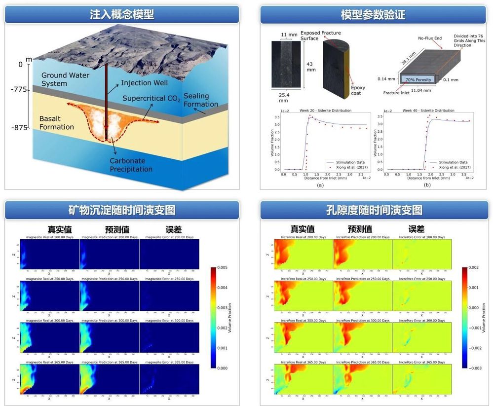 针对玄武岩矿化封存时空演化规律与布井优化需求,团队构建了基于反应动力学的数值模型,并通过实验验证了算法可靠性。采用嵌入时间编码的UNet-Self-Attention模型,模型空间相似性指数超过0.96,矿物封存量预测R²达0.98以上,可准确捕捉矿化时序变化。参数分析表明,顶部布井可使近井孔隙度降幅降至底部方案的三分之一,为优化封存设计、保障长期安全注入提供了关键技术支撑。