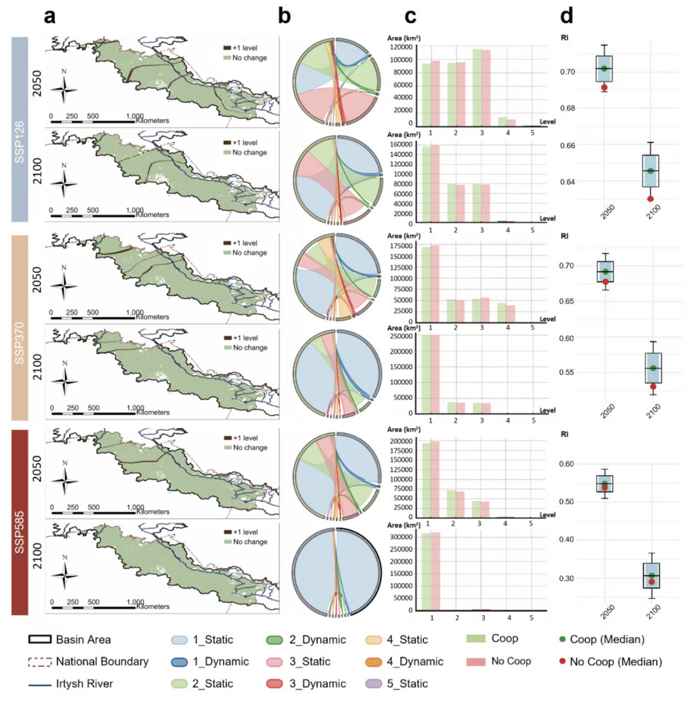 研究通过中哈俄三国的多源数据融合与模型协同,以额尔齐斯河流域为案例,利用CMIP6气候情景数据,进行高分辨率跨境农牧系统韧性综合评估,为复杂流域的协同适应研究提供了一个跨国、多尺度、可复制的研究范式,为“一带一路”沿线国家的气候适应政策提供了科学支撑。同时,定量验证了跨国协作机制不仅能增强流域应对气候变化的能力,还能为区域粮食安全与社会稳定提供有力支撑。