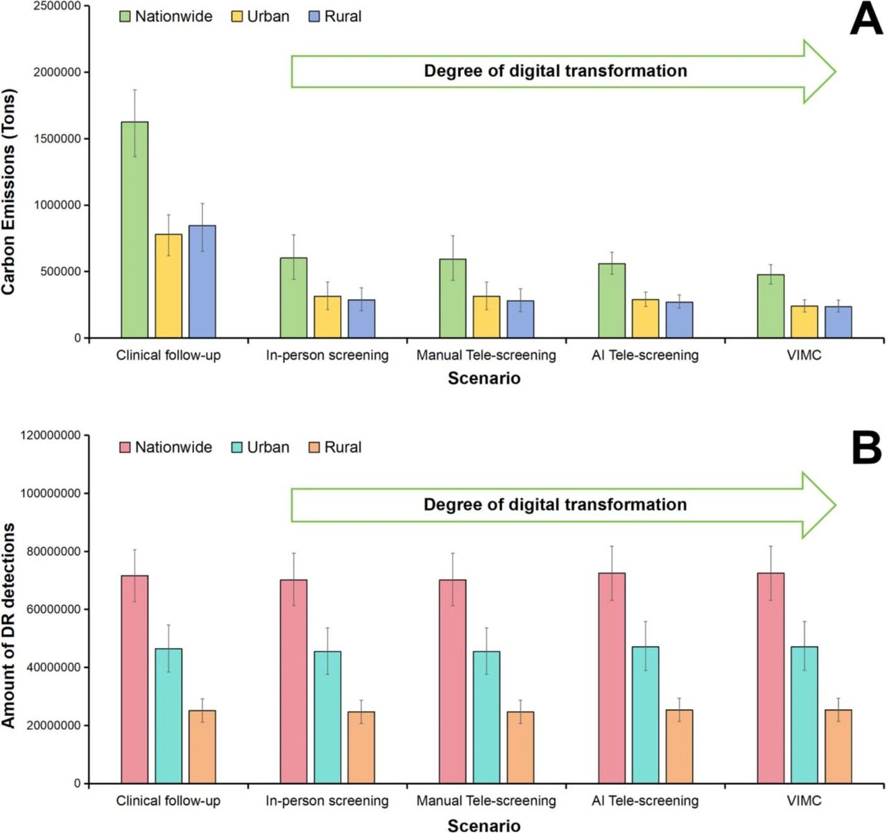 图2. 五种糖尿病视网膜病变检测方案的碳排放量与有效性对比(假设医疗资源充足,但取消完美遵从性假设)DR:糖尿病视网膜病变;AI:人工智能;VIMC:视觉智能管理中心。A:总碳排放量;B:糖尿病视网膜病变总检出病例数。各柱状图上的垂直黑线表示对应的95%置信区间。