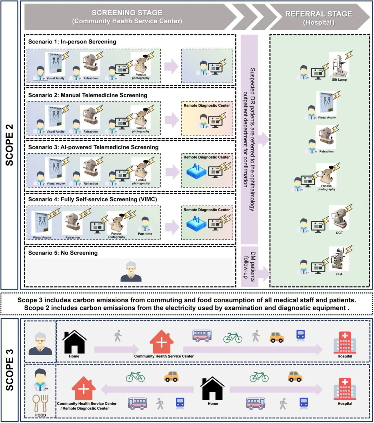 图1. 五种情景的流程图及碳排放阶段OCT:光学相干断层扫描;FFA:荧光素血管造影。