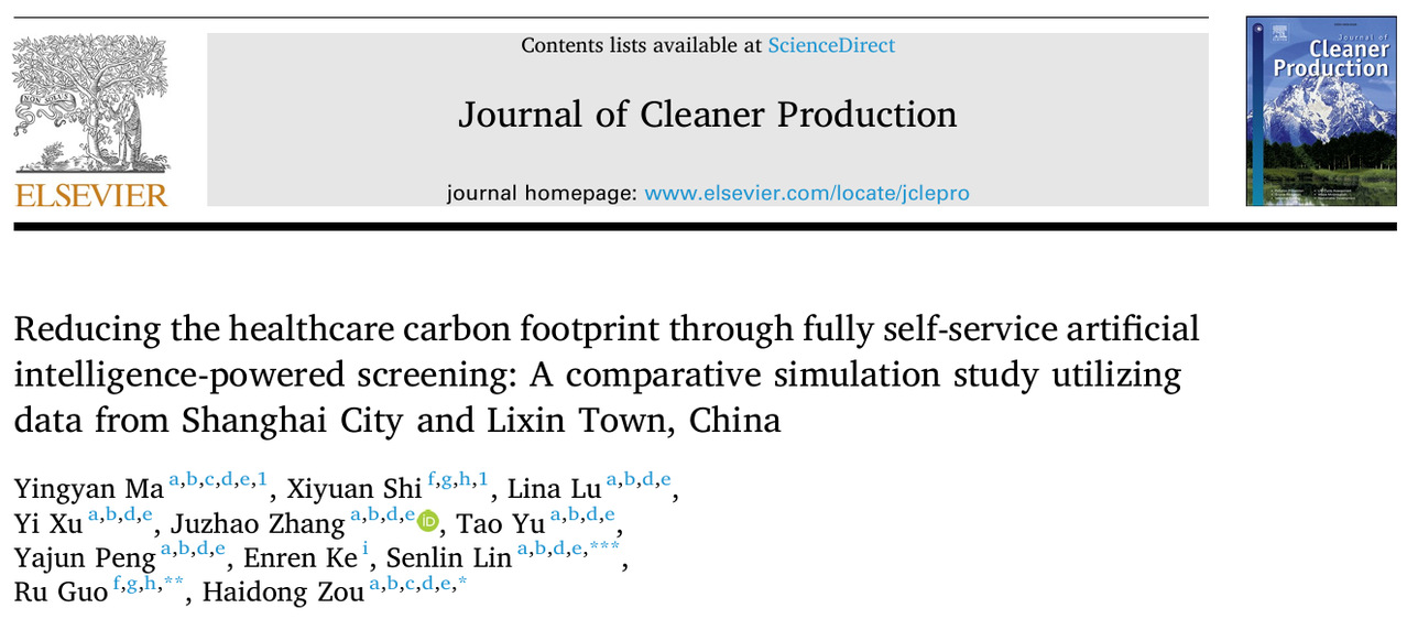 近日,同济大学环境科学与工程学院郭茹教授团队与上海眼病防治中心院长邹海东教授团队在《Journal of Cleaner Production》(中科院1区Top期刊,JCR Q1,IF2025=10.0)发表重要研究,聚焦医疗健康场景中的碳排放问题:在保障健康收益的前提下,如何通过数字化与人工智能实现医疗服务“降碳增效”? 该研究依托我院碳核算与评价优势,联合医疗团队形成跨学科合作,为碳中和背景下的“健康-环境”协同治理提供了可量化证据与可复制方法。