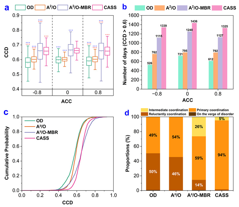 进水时间自相关会显著改变协同表现的分布形态与可维持水平。强自相关情景ACC = ± 0.8会使CCD分布明显变宽,而ACC = 0时更集中。在1461天模拟中,A2/O-MBR与CASS能够在CCD大于0.6的高协同状态下维持超过1100天,而OD与A2/O不足800天,显示先进工艺在高协同维持能力上具有优势。进一步的讨论强调,当ACC由0偏移至± 0.8时,各厂高协同天数均出现下降,最大降幅可达约27%,并且CASS在ACC = 0且历史相关结构下仍有约94%的CCD落在Primary Coordination区间,反映其协同表现兼具高水平与高稳定性。