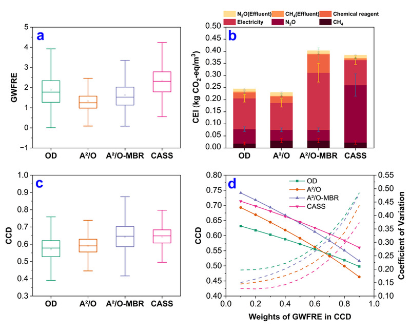 Figure 1. (a) Box plot of daily Grey Water Footprint Reduction Efficiency (GWFRE). (b) Component-wise breakdown of daily average Carbon Emission Intensity (CEI). (c) Box plot of daily Coupling Coordination Degree (CCD) in benchmark scenario (equal weighting). (d) Influence of the GWFRE weight on CCD: solid lines show the average CCD (left axis) and dashed lines show its Coefficient of Variation (right axis)