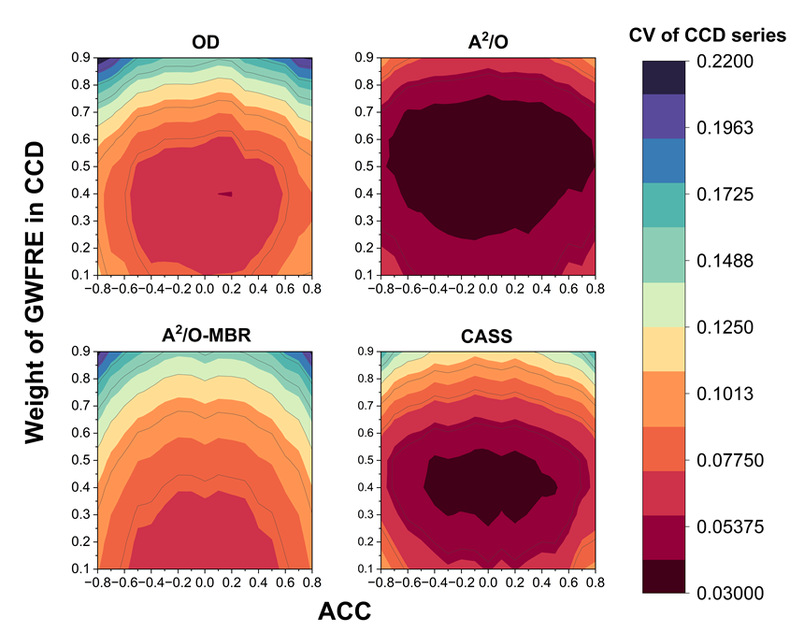 协同稳定性由权重取向与时间自相关共同驱动,且存在跨工艺一致的最优窗口。总体规律是,当ACC处于弱自相关区间,约在−0.1至0.2,同时权重处于中等范围时,CCD序列CV达到最低,稳定性最优。尽管共同趋势明确,不同工艺的最优权重位置存在差异,例如A2/O的最低CV可达0.030,而A2/O-MBR的最低CV约为0.063且更偏向控碳导向权重,这与其对持续性进水模式更敏感的特征一致。讨论进一步以定量证据指出,ACC从0偏移到±0.8会引起CV上升约34%至68%,并形成工艺敏感性排序,A2/O-MBR最高、OD次之、CASS再次、A2/O最低,说明膜处理系统虽具较高基线协同水平,但对持续性扰动更脆弱,技术部署与权重设定需要同时考虑预期进水持续性特征。
